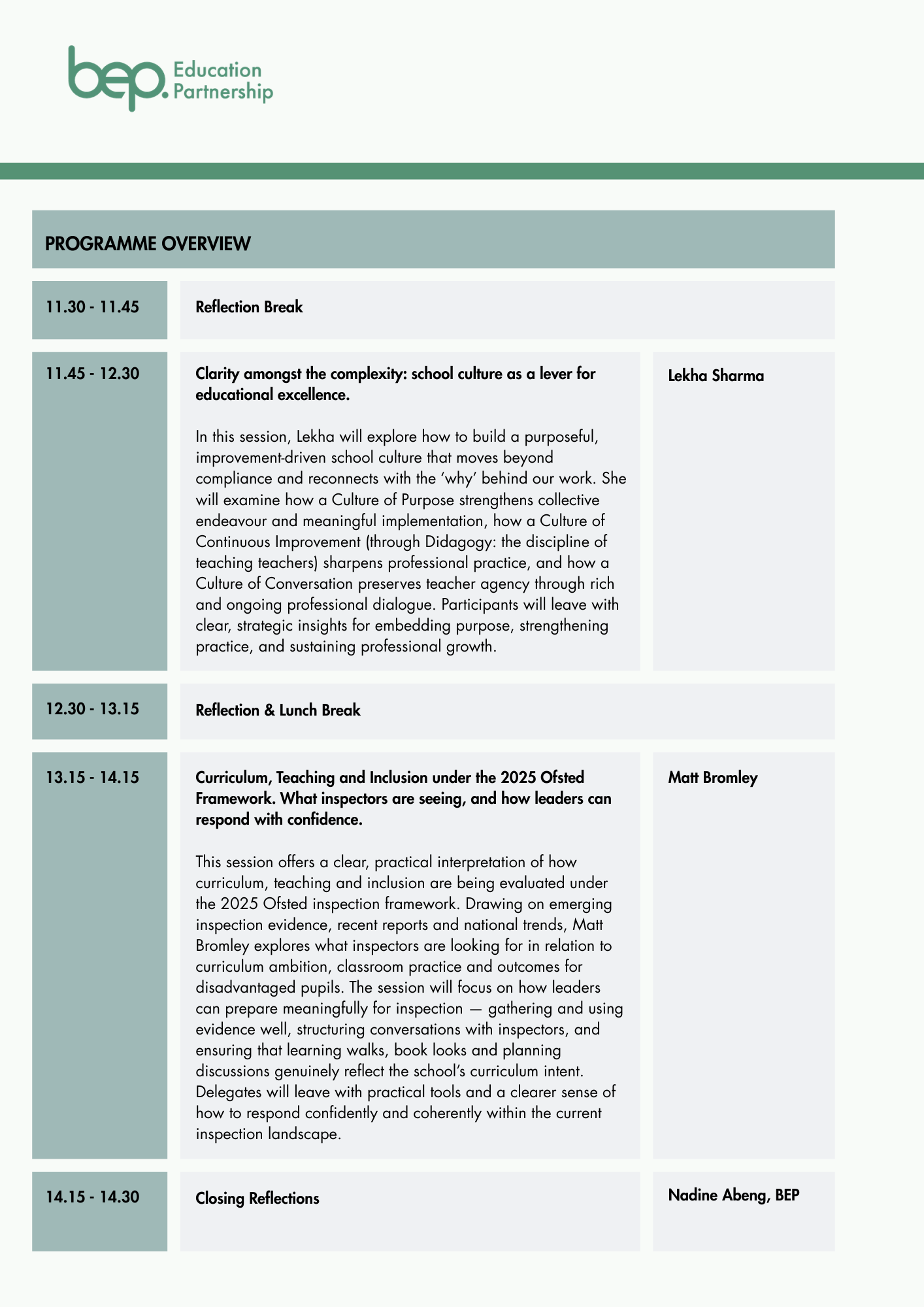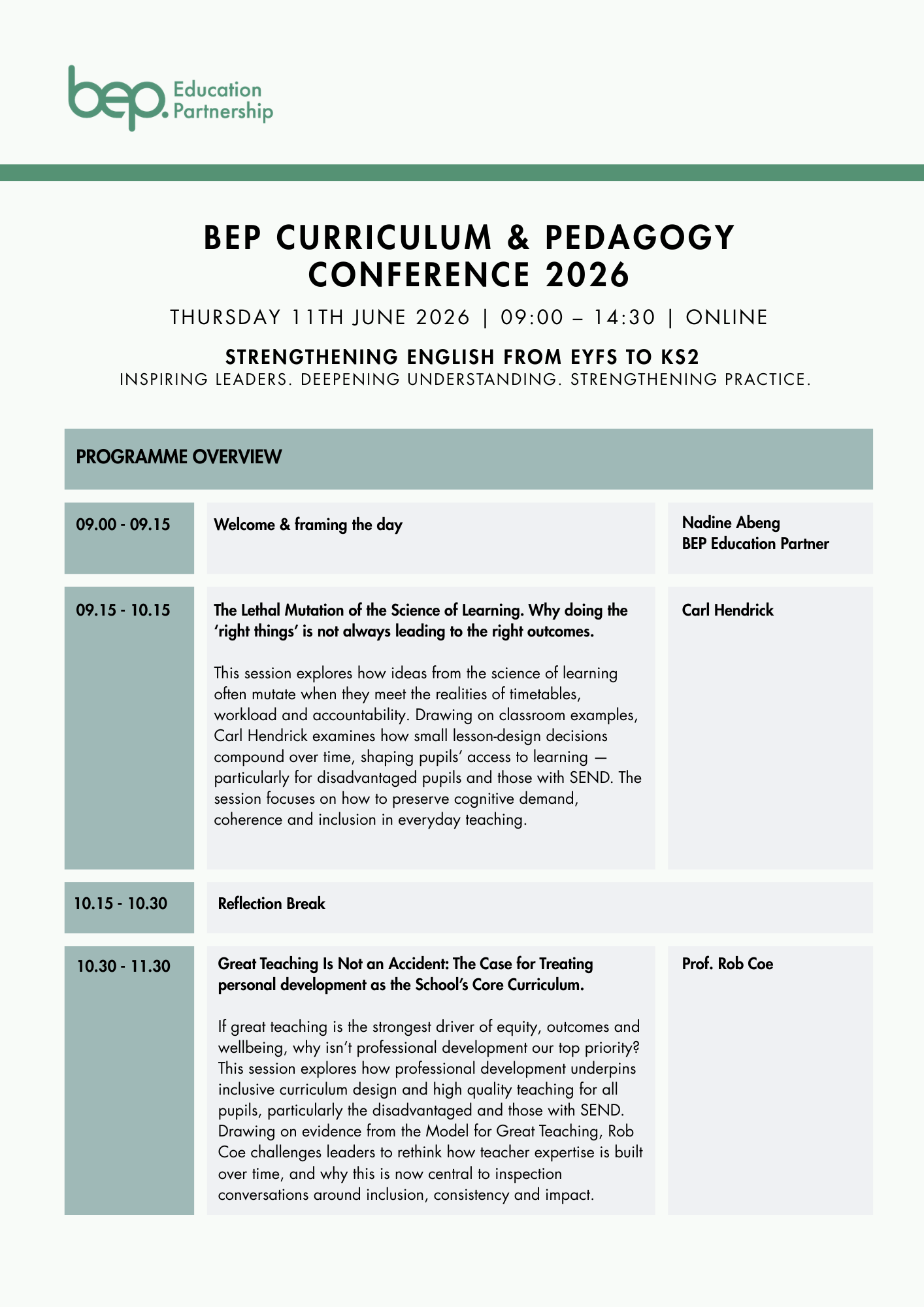 Schools are navigating an increasingly complex landscape: ambitious curricula, rising expectations around inclusion, evolving inspection frameworks, and the daily realities of classrooms under pressure. This conference brings together leading thinkers in learning science, curriculum design and inspection interpretation to explore how evidence becomes impact in real schools. Across the day, we focus on the decisions that matter most — how teaching is designed, how professional learning is structured, and how curriculum ambition is preserved for all pupils, particularly the disadvantaged. The aim is not new initiatives, but clearer thinking, greater coherence, and practical insights leaders can use with confidence.