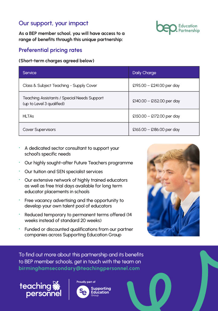 We are pleased to announce that for 2025/26, BEP has partnered with Teaching Personnel to bring all BEP Members preferential rates and response times for Teaching Personnel services.